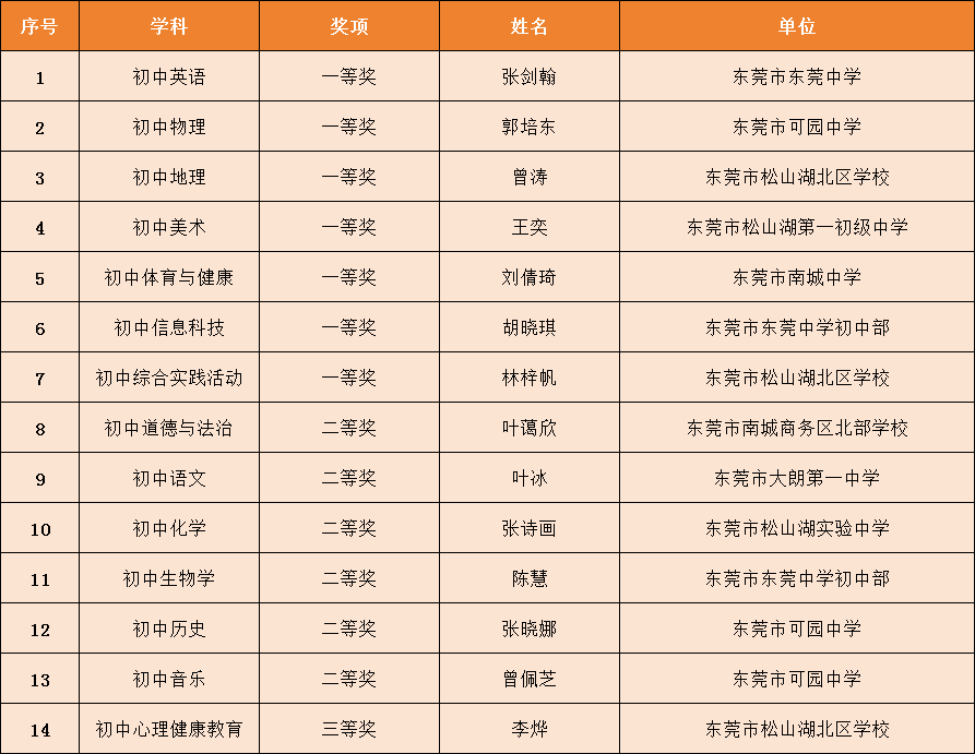 第五届广东省中小学青年教师教学能力大赛初中组获奖名单(东莞)