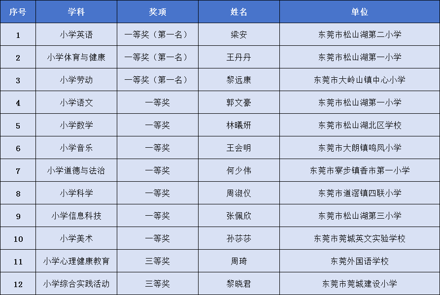 第五届广东省中小学青年教师教学能力大赛小学组获奖名单(东莞)