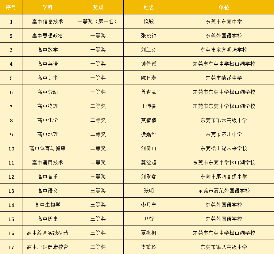 第五届广东省中小学青年教师教学能力大赛高中组获奖名单(东莞)
