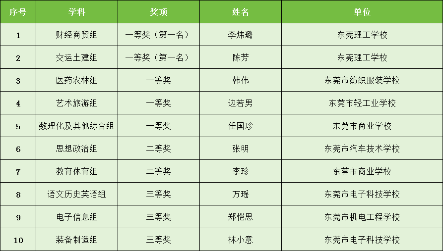 第五届广东省中小学青年教师教学能力大赛中职组获奖名单(东莞)